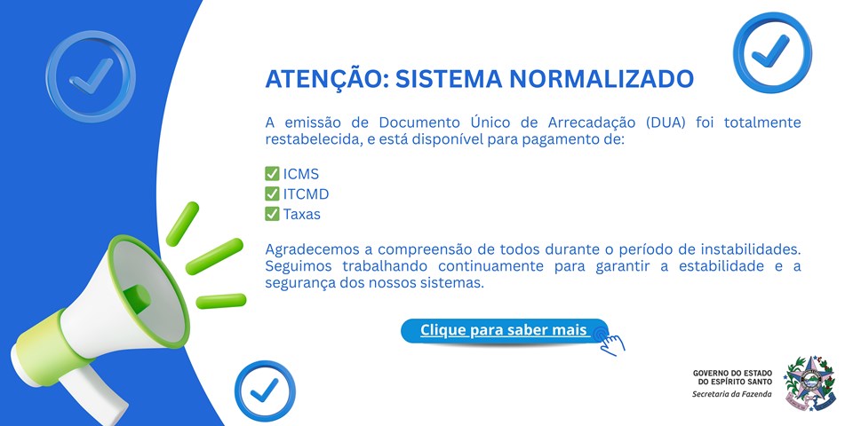 Notícias 10/04/2026 Reforma Tributária: Sefaz orienta contribuintes sobre preenchimento de IBS e CBS nas notas fiscais eletrônicas A obrigatoriedade já está em vigor em 2026; a Receita Estadual alerta para a necessidade de adaptação dos sistemas. 09/04/2026 Sefaz inicia execução do seu Planejamento Estratégico Documento construído de forma colaborativa orienta metas, projetos e fortalece a gestão diante dos desafios da reforma tributária. 08/04/2026 Restabelecimento total do sistema de emissão de DUA é concluído nesta quarta-feira (08) Serviços foram normalizados após instabilidades registradas nos últimos dias. Já o pagamento de taxas ainda apresenta instabilidades. 02/04/2026 Sefaz prorroga prazos de ICMS e amplia período de opção por regime de cálculo Medidas publicadas em edição extra do Diário Oficial nesta quinta-feira (02) buscam mitigar impactos de instabilidades nos sistemas da Secretaria da Fazenda 01/04/2026 Nota Oficial Instabilidades e interrupções nos sistemas da Sefaz Mais Notícias
