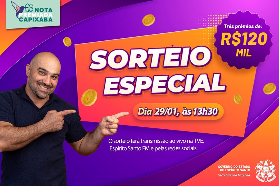 Chegou a hora de conhecer os ganhadores do super prêmio especial anual do Nota Premiada Capixaba, o maior programa de educação fiscal do Estado. O sorteio – que é transmitido ao vivo pela TVE Espírito Santo, Espírito Santo FM e nas redes sociais da emissora – acontece nesta quinta-feira (29), às 13h30, e vai distribuir três prêmios especiais no valor de R$ 120 mil, um para cada região: Metropolitana, norte e sul do Estado.