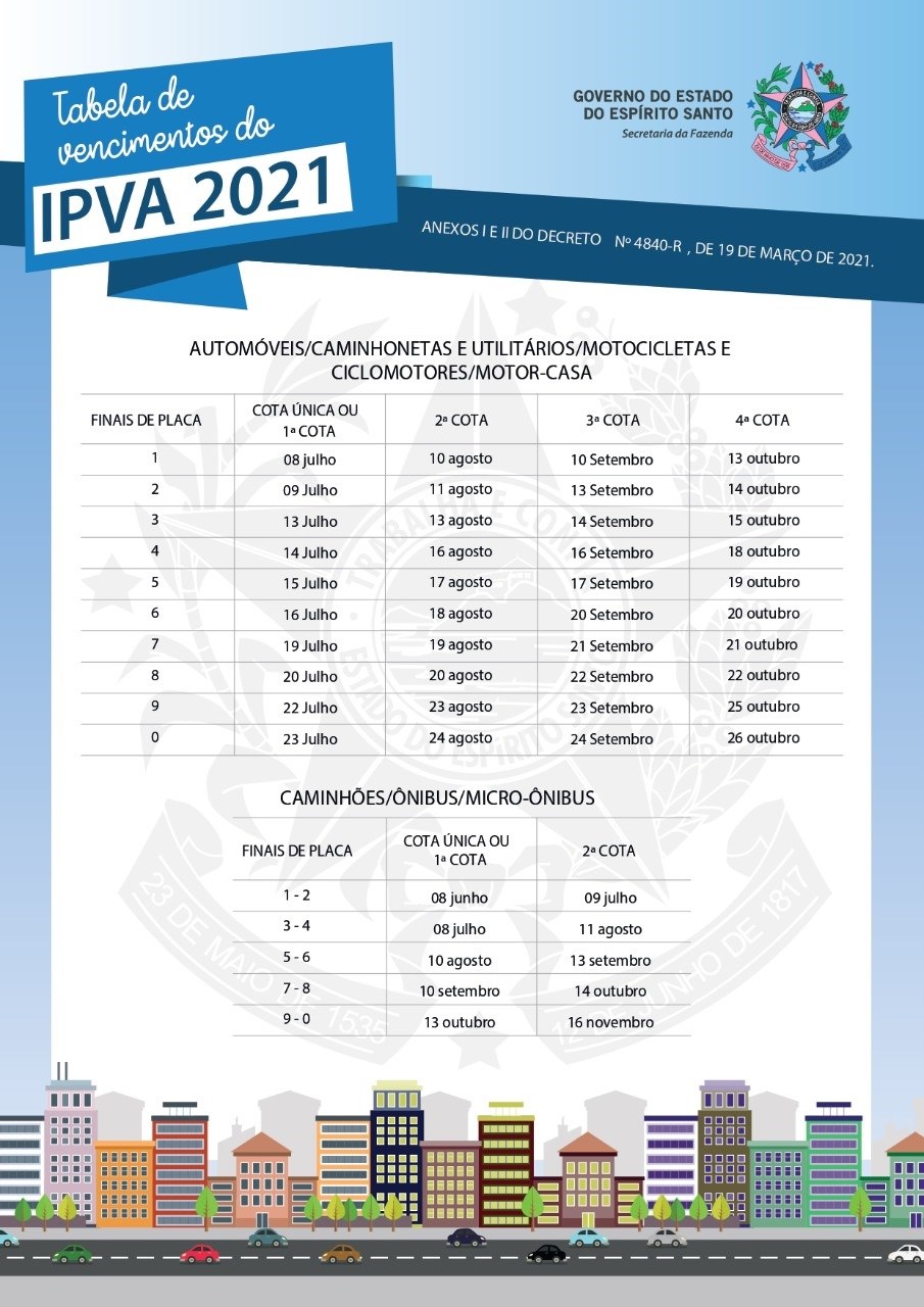 O vencimento da primeira parcela ou cota única será nesta quinta-feira (08), para os veículos leves que tenham as placas terminadas em 1. A tabela com todas as datas pode ser vista no final deste texto.