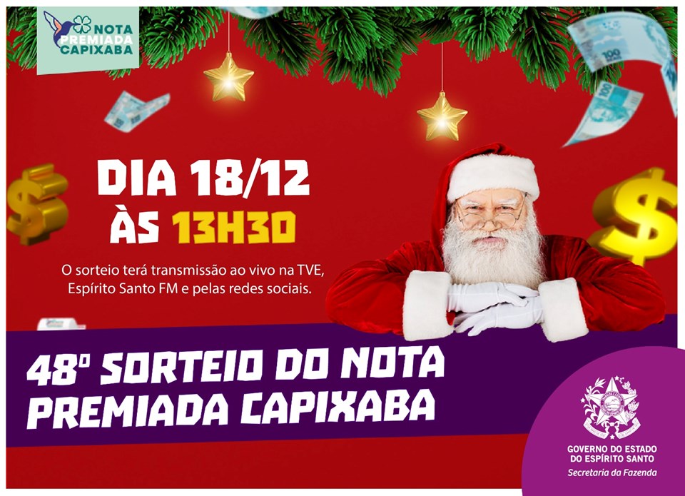 O sorteio será transmitido ao vivo pela TVE Espírito Santo, Espírito Santo FM e redes sociais da emissora. Como acontece todos os meses, serão sorteados 15 prêmios, cinco para cada região, a Metropolitana, a norte e a sul, nos valores de R$ 25 mil, R$ 7 mil, R$ 5 mil, R$ 2,5 mil e R$ 1,5 mil. Participarão os bilhetes gerados por meio das notas fiscais emitidas entre os dias 1º e 30 de novembro. Cada R$ 1,00 em compras vale um ponto e, a cada 50 pontos, é gerado um bilhete para concorrer aos prêmios.