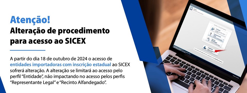 Atenção, usuários do Sistema de Comércio Exterior (Sicex) da Secretaria da Fazenda: a partir desta sexta-feira (18), o acesso de entidades importadoras com inscrição estadual à plataforma será alterado. A mudança se limitará ao acesso pelo perfil “Entidade”, não impactando no acesso pelos perfis “Representante Legal” e “Recinto Alfandegado”.