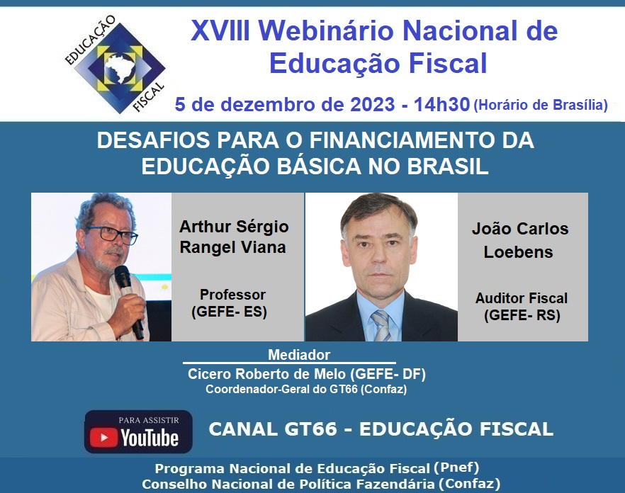 A apresentação do tema, em contexto de cidadania fiscal e importância do aperfeiçoamento do Fundeb, será conduzida pelo auditor fiscal e coordenador do Grupo Estadual de Educação Fiscal do Rio Grande do Sul, João Carlos Loebens, e pelo professor da rede pública do Espírito Santo e coordenador do curso Disseminadores de Educação Fiscal, Arthur Sérgio Rangel Viana, que atua na Subgerência de Educação Fiscal da Secretaria da Fazenda (Sefaz).