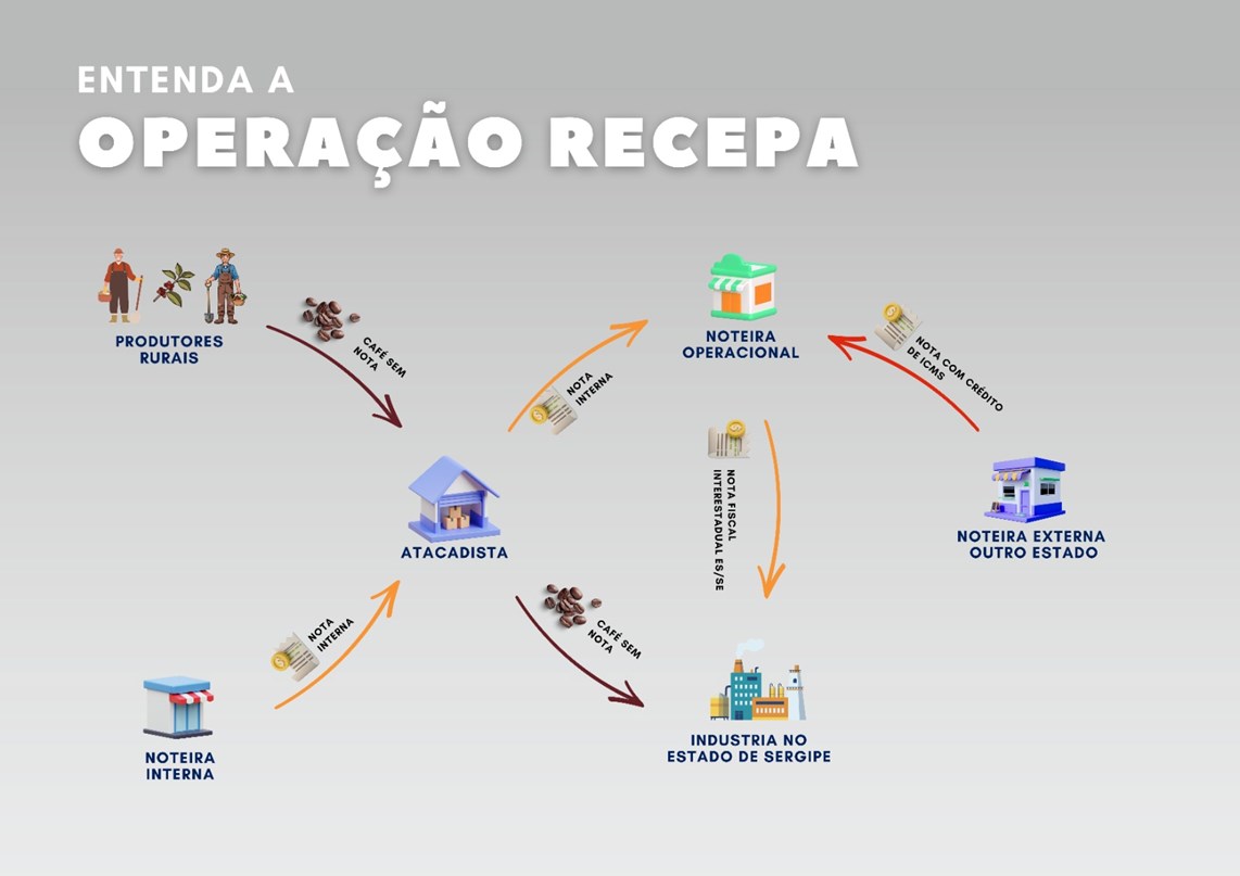 As investigações apontam que a organização criminosa simulava operações fiscais por meio de empresas “noteiras”, criadas exclusivamente para emissão de notas fiscais falsas, a fim de ocultar a origem do café, gerar créditos fiscais irregulares e suprimir ou reduzir o ICMS devido, especialmente em remessas interestaduais para Sergipe.