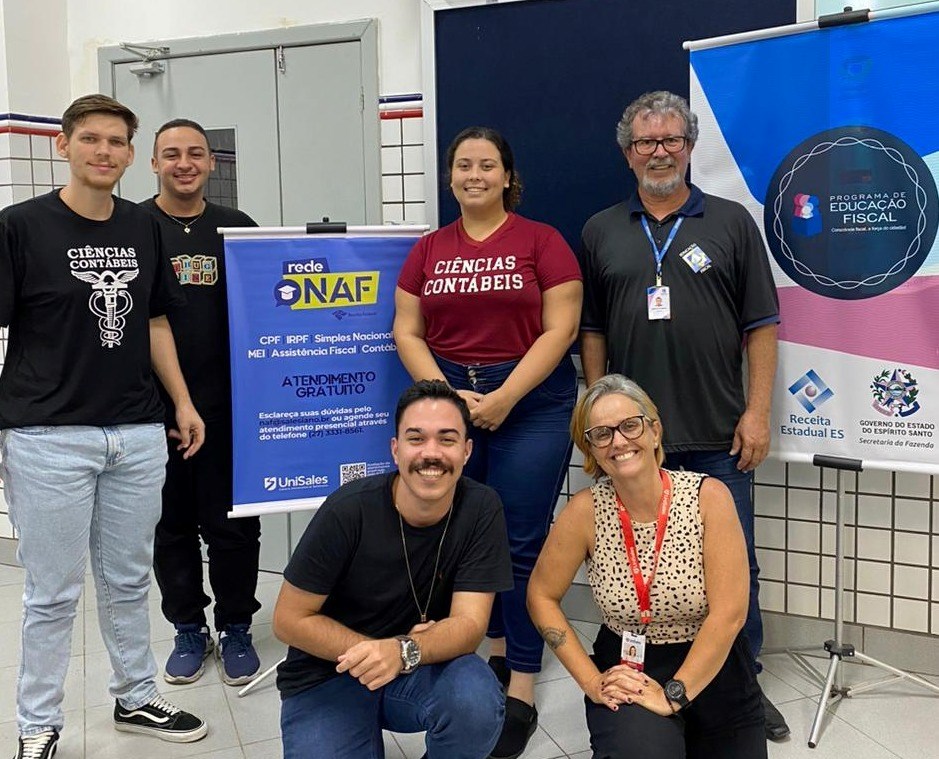 A convite da professora do Curso de Ciências Contábeis do Centro Universitário Salesiano (UniSales) e coordenadora do Núcleo de Apoio Contábil e Fiscal (NAF) da instituição, Julyana Goldner Nunes, a Subgerência de Educação Fiscal da Secretaria da Fazenda (Sefaz), representada pelo coordenador do curso Disseminadores de Educação Fiscal, o professor Arthur Sérgio Rangel Viana, realizou uma palestra para estudantes do 5º período do Curso de Ciências Contábeis, no último dia 1º de abril.