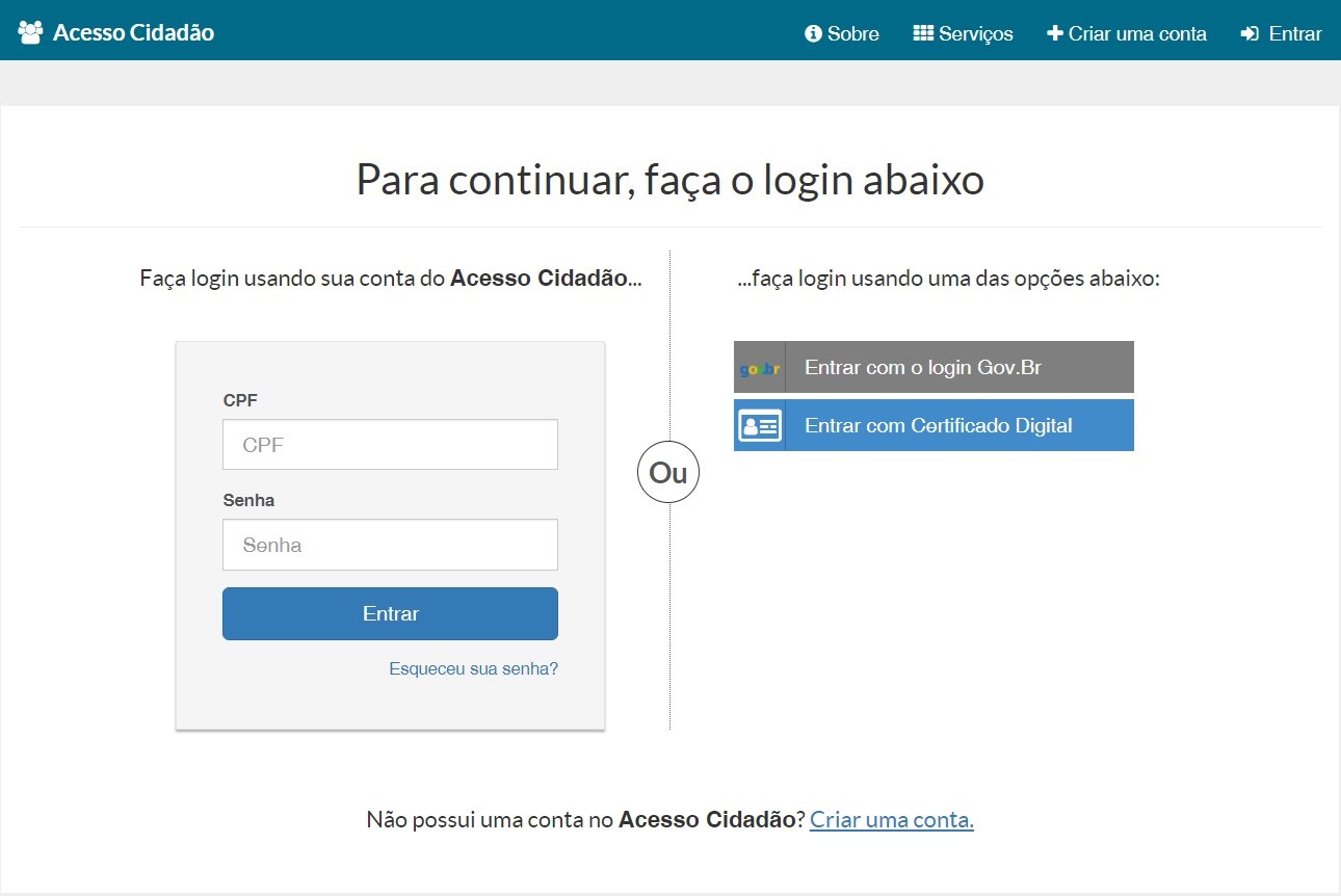 Ao clicar no local indicado, o contribuinte será direcionado para o "Acesso Cidadão", onde deverá fazer o login ou criar uma conta.