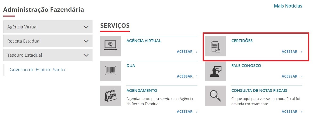O primeiro passo é localizar o link "Certidões", na tela inicial do site da Secretaria da Fazenda (Sefaz). O link está na parte de "Serviços".