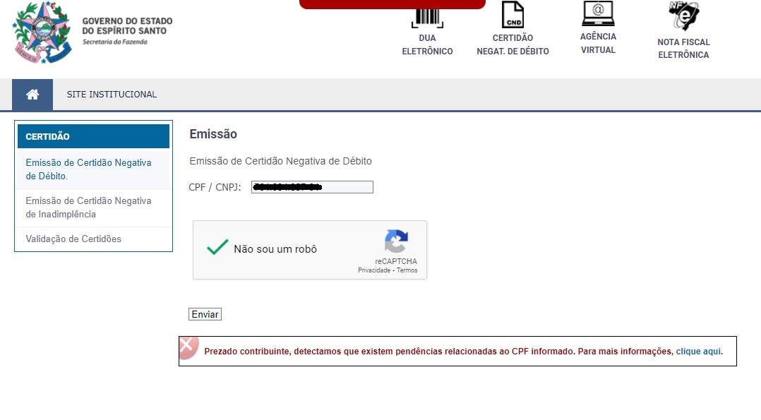 Se o usuário não tiver débitos com o Estado, ele terá acesso à certidão negativa de débito. Caso ele tenha alguma pendência, vai aparecer a seguinte mensagem: "Prezado contribuinte, detectamos que existem pendências relacionadas ao CPF informado. Para mais informações, clique aqui".