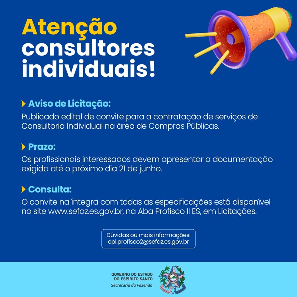 A Secretaria da Fazenda (Sefaz) publicou, no Diário Oficial do Estado de segunda-feira (10), um convite para a contratação de Consultor Individual na área de Compras Públicas. O documento na íntegra com todas as especificações está disponível no site www.sefaz.es.gov.br, na Aba Profisco II ES, em Licitações.
