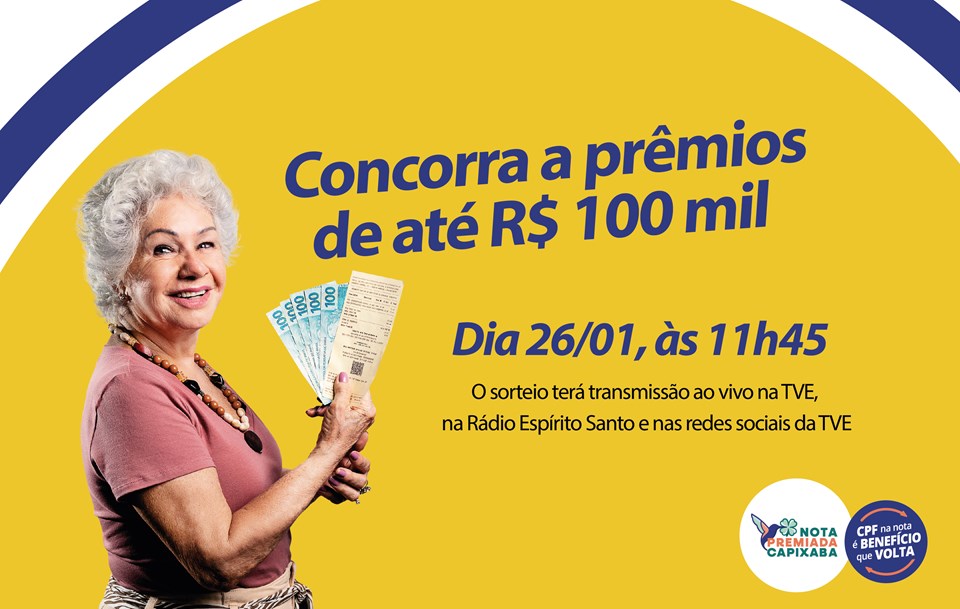 O 13º sorteio do Nota Premiada Capixaba será nesta será nesta quinta-feira (26), com transmissão ao vivo, às 11h45, na TVE e nas redes sociais da emissora. Desta vez, além dos prêmios mensais, o sorteio contará com o sorteio especial anual. Ao todo, serão distribuídos 15 prêmios, sendo cinco para cada região delimitada: Metropolitana, norte e sul. Dos cinco prêmios por região, um será no valor de R$ 20 mil, dois de R$ 5 mil, um de R$ 2.500,00, e um prêmio especial de R$ 100 mil.