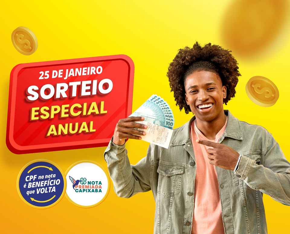 O sorteio especial anual do Nota Premiada Capixaba, no próximo dia 25 de janeiro, vai distribuir quase R$ 400 mil em dinheiro aos premiados. Além dos prêmios mensais –um de R$ 20 mil, dois de R$ 5 mil e um de R$ 2,5 mil para cada região – será sorteado um prêmio de R$ 100 mil para cada uma das regiões, a Metropolitana, a norte e a sul.