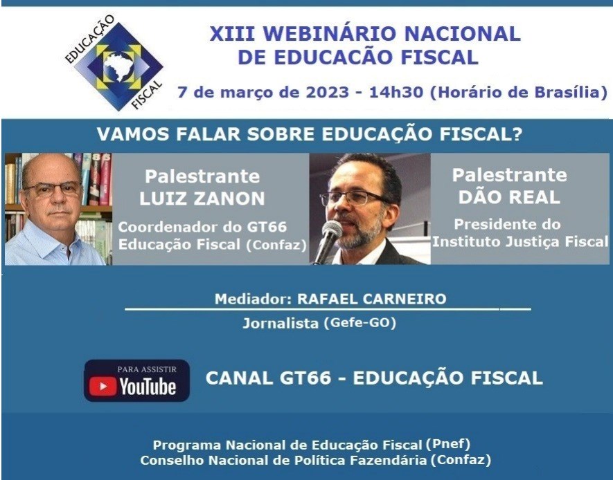 A 13ª edição do Webinário Nacional de Educação Fiscal acontecerá no próximo dia 7 de março, a partir de 14h30, com transmissão ao vivo pelo Canal "GT66 Educação Fiscal" no Youtube.