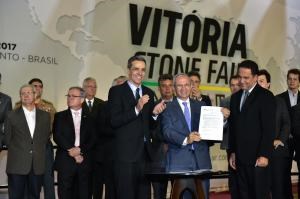 Começou nesta terça (06) a 43ª edição da maior feira de mármores e granitos da América Latina, a Vitória Stone Fair. Cerca de 300 expositores, nacionais e de 18 países, e aproximadamente 20 mil visitantes são esperados na exposição, que segue até sexta (09), no Pavilhão de Carapina, na Serra. Na abertura, algumas novidades, como assinatura do decreto que amplia o prazo de recolhimento de ICMS dos negócios realizados durante o evento e do protocolo para criação de laboratório de identificação de rochas. A Vitória Stone Fair l Marmomac Latin America é um dos eventos mais importantes para a economia do Espírito Santo, que movimenta a cada ano milhões em negócios e destaca internacionalmente as belezas das rochas ornamentais capixabas. Durante a solenidade de abertura o governador Paulo Hartung destacou que mesmo com a crise socioeconômica que castiga o país, o Espírito Santo está com as contas em dia e avançando na modernização de sua infraestrutura para enfrentar os gargalos históricos. "Com toda sua força e vigor no Estado e o no país, a Feira e o setor de mármore e granito encontram no Espírito Santo um Estado forte e organizado. A crise não é mole para ninguém. Quando passar, vamos olhar e perceber sua dimensão para o trabalho e famílias. O que diferencia, é como atravessamos a crise. Tenho certeza que o Estado será portador de oportunidade do pós-crise", disse Hartung. O evento, que fomenta negócios e é palco de lançamentos, é um dos maiores do setor na América Latina. “As rochas ornamentais são um segmento importante para o Estado, que é responsável por cerca de 80% das exportações brasileiras e gera aproximadamente 20 mil empregos diretos e 100 mil indiretos. E é nesta feira que temos a oportunidade de mostrar a força do setor, de fomentar negócios, lançar novidades e ficar mais próximos do mercado”, destacou o secretário de Estado de Desenvolvimento, José Eduardo Azevedo. "É com muita honra que volto ao Estado para essa belíssima feira, que mostra que o Brasil não está parado e é com muitos brasileiros como vocêss que iremos ajudar a virar a página da crise", afirmou o ministro das Minas e Energia, Fernando Coelho. ICMS Durante a cerimônia de abertura oficial do evento, o governador Paulo Hartung assinou decreto que amplia para aproximadamente 90 dias o prazo de recolhimento do ICMS de operações realizadas durante a Vitória Stone Fair e a Cachoeiro Stone Fair. Desta forma, o imposto incidente sobre as operações realizadas de 6 a 9 de junho, na Vitória Stone Fair, deverá ser recolhido até o dia 19 de setembro. Já o imposto incidente sobre as operações ocorridas de 22 a 25 de agosto, na Cachoeiro Stone Fair, deverá ser recolhido até o dia 19 de novembro. Também durante o evento, o Sindicato da Indústria de Rochas Ornamentais, Cal e Calcários do Espírito Santo (Sindirochas) e o Serviço Nacional de Aprendizagem Industrial (Senai) assinaram um protocolo de intenções, para reunir esforços na criação de um laboratório para a identificação de rochas em Cachoeiro de Itapemirim. Expositores A Vitória Stone Fair reúne expositores nacionais e internacionais de países como Angola, Bélgica, China, Colômbia, Espanha, Estados Unidos, Coreia do Sul, França, Índia, Inglaterra, Itália, Portugal, Rússia, Singapura, Suécia, Turquia Venezuela e Vietnã. Além da variedade de rochas naturais que serão lançadas no evento, os visitantes terão a oportunidade de conhecer novas formas de beneficiamento de pedras, insumos, maquinários, novas tecnologias e aplicabilidade da pedra. A feira contará ainda com palestras, mesa-redonda, debates gratuitos e premiações. O Governo do Estado terá um estande no evento, onde será possível conhecer linhas de crédito e outros produtos financeiros do Banestes e do Banco de Desenvolvimento do Espírito Santo (Bandes). No espaço, a Secretaria de Estado de Desenvolvimento (Sedes) mostrará as oportunidades de negócios no Estado e a Secretaria de Estado de Turismo (Setur) divulgará os encantos dos atrativos turísticos do Espírito Santo com postais, mapas e roteiros. Outra atração será a exposição de produtos do agroturismo capixaba: cafés, queijos, produtos orgânicos e cachaças. “A Vitória Stone Fair é importante pois movimenta a cadeia produtiva do turismo na Grande Vitória, especialmente em hotelaria e serviços, já que os participantes aproveitam o período aqui para desfrutar das opções turísticas locais. O sucesso desse evento mostra que o Espírito Santo tem excelentes oportunidades, estrutura e atendimento para o segmento de eventos”, acrescentou o secretário de Estado de Turismo, José Sales Filho. A Vitória Stone Fair é realizada pela Milanez & Milaneze, empresa do Grupo Veronafiere, promovida pelo Sindicato das Indústrias de Rochas Ornamentais, Cal e Calcários do Estado (Sindirochas) e pelo Centro Tecnológico do Mármore e do Granito (Cetemag). Saiba mais As rochas ornamentais capixabas estão mais valorizadas no mercado internacional. Numa estratégia dos empresários do segmento, o preço dos mármores e granitos subiu mais de 6% no último mês de abril, se comparado ao mesmo período do ano passado. No acumulado, a alta é de 1,31%, em relação a 2016. Os dados são do Centro Brasileiro dos Exportadores de Rochas Ornamentais (Centrorochas) e apontam também a hegemonia dos Estados Unidos como principal consumidor das rochas brasileiras no mundo, ao importarem US$ 222,4 milhões de janeiro a abril deste ano; seguidos pela China, com US$ 34,6 milhões no mesmo período. Tradicionalmente, o Espírito Santo é o estado com os números mais significativos de exportação de rochas do Brasil. Em 2017, continua na liderança como maior exportador de pedras do país, com uma participação de 82% no total vendido, somando, sozinho, US$ 277,4 milhões dos US$ 336,3 milhões exportados pelo Brasil de janeiro a abril de 2017. O 